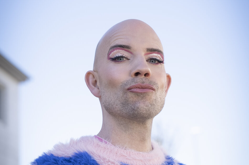 Nicht nur die Farbe, sondern auch die Person; Pink Büchsenschütz. Und das ist auch ein bisschen das Ziel des Grafikdesigners, der genderfluid ist und zwischen männlichen und weiblichen Pronomen wechselt. An diesem Morgen lässt sie sich in Düsseldorf von Make-up-Artist Arthur Auinger schminken – mit pinkem Lidschatten, natürlich.