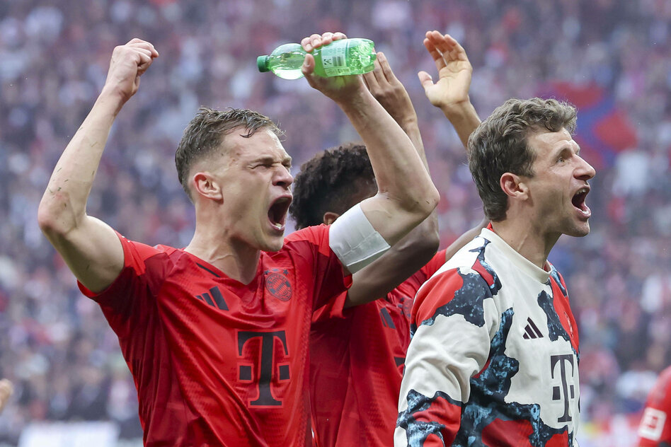Die ganz große Party mit den Fans auf dem Marienplatz, wo [3][zusammen mit dem Frauenteam,] das neben der Meisterschaft auch den Pokal gewonnen hat, vom Rathausbalkon gewunken wird, steigt erst am 18. Mai. Die Meisterschale haben die Bayern dann schon eine Woche lang, und auch wenn sich die Spieler mit dem Gebräu des Biersponsors innen und außen reichlich benetzen werden, rechnet niemand damit, dass die Stadt in totale Ekstase verfällt.