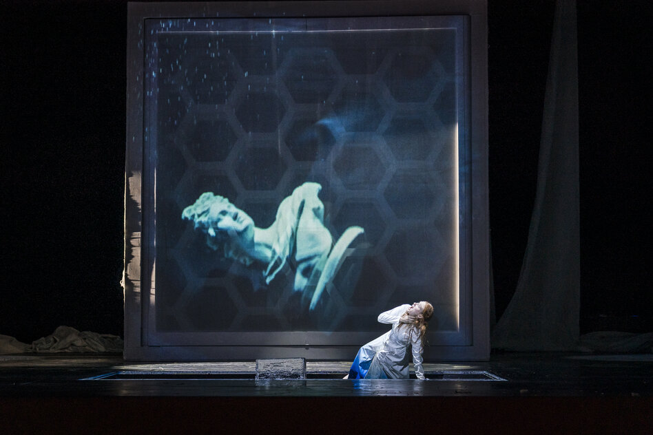 Inszeniert hat die Videokünstlerin Marie-Eve Signeyrole. Sie bebildert die Bühne auf drei Ebenen: Im Vordergrund spielen die Sänger*innen, dahinter steht ein Kubus, mit dem interagiert, auf den aber auch projiziert werden kann, und der so wechselnde Orte darstellt. Noch weiter im Hintergrund hängen weiße Stoffbahnen, auf denen die Hauptmotive der Oper sich als Videos abwechseln: Eis, Bienen, und Seelen.