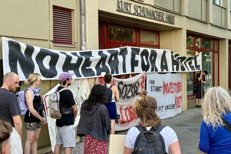Im Bezirk Friedrichshain-Kreuzberg drückt der Senat immer mehr Projekte gegen den Bezirk durch. Anwohner protestieren vor der Berliner SPD-Zentrale.