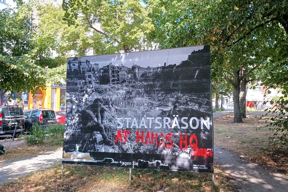 Plötzlich hing da dieses Plakat unweit des Görlitzer Parks in Berlin. Ein in sich zusammengesunkener Mann vor der Mondlandschaft einer zerstörten Stadt in Gaza, daneben stand: „Staatsräson“, und darunter: „Zu Risiken und Nebenwirkungen fragen Sie Palästinenser.“ Zu der Zeit, Mitte des Jahres 2024, galt es für viele Menschen noch als undenkbar, auch nur zu fragen, ob im Gazastreifen womöglich Kriegsverbrechen geschehen.