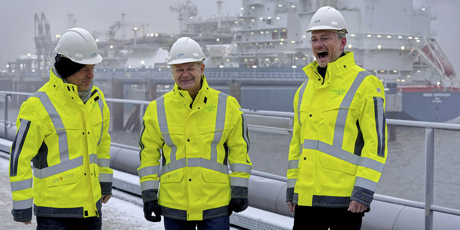 Wilhelmshaven dpa | Bundeskanzler Olaf Scholz hat in Wilhelmshaven das erste Flüssigerdgas-Terminal Deutschlands eröffnet. [1][Die Errichtung in der Rekordzeit von knapp zehn Monaten] zeige: „Unser Land kann Aufbruch und Tempo“, sagte der SPD-Politiker am Samstag bei der Einweihungszeremonie, an der auch Wirtschaftsminister Robert Habeck (Grüne), Finanzminister Christian Lindner (FDP) und Niedersachsens Ministerpräsident Stephan Weil (SPD) teilnahmen. Das schwimmende Terminal vor der niedersächsischen Nordseeküste soll dazu beitragen, die durch ausbleibende Lieferungen aus Russland entstandene Lücke bei der Gasversorgung Deutschlands zu schließen.