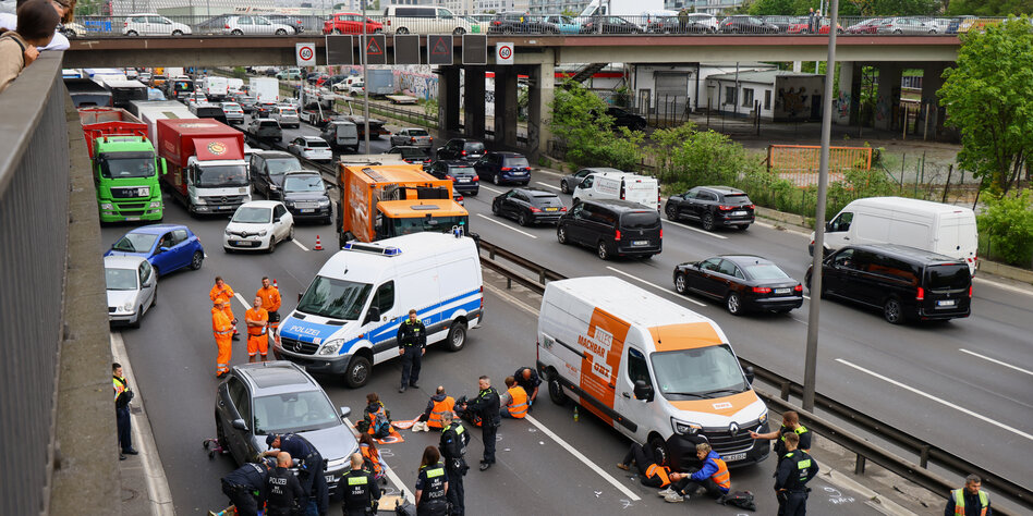 Die Klima-Demonstranten der [5][Gruppe Letzte Generation] blockierten am Dienstagmorgen im Berufsverkehr elf große Durchgangsstraßen und Kreuzungen im ganzen Stadtgebiet. Darunter war nach Polizeiangaben auch die Stadtautobahn A100 zwischen Spandauer Damm und Kaiserdamm.