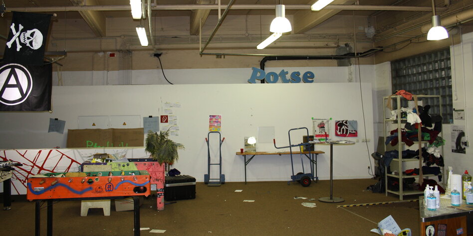 Berlin taz | Ein lautes Quietschen hallt durch die Zollgarage am Tempelhofer Feld, als sich deren weiße Stahltür langsam öffnet. Früher dienten die Hallen als Logistikfläche für US-amerikanische Truppen. Heute führt die Tür [1][zu den neuen Räumen des selbstverwalteten Jugendclubs Potse]. Drinnen springen einem auch direkt die blauen Potse-Lettern ins Auge, die schon früher den Besucher*innen klarmachten, wo sie sich befinden. Selbst das alte For-Free-Regal hat seinen Platz direkt neben der Tür gefunden.