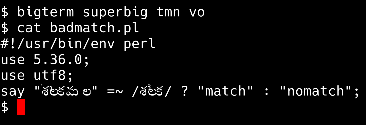 say "శ్లొకముల" =~ /శ్లోక/ ? "match" : "nomatch";