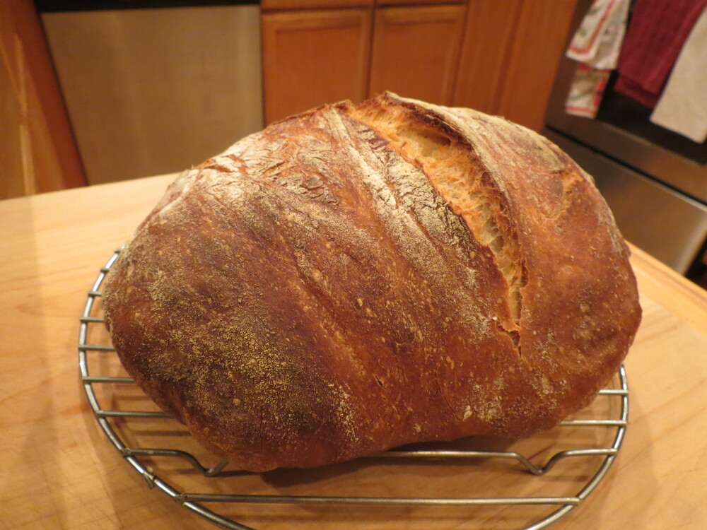 Place the dough bottom side up in the dutch oven. Cover and bake for 30 minutes. Remove cover and bake for 15 to 20 more minutes. Let the loaf sit for at least 30 minutes after baking. If the bread knife does not come out clean after cutting, the loaf needed more time to rest. Cover the bread once it cools off to keep bugs and dust out, and some of the hydration in.