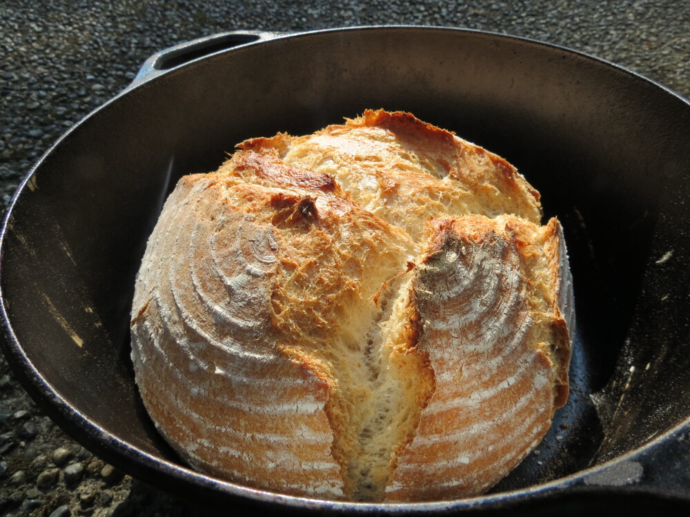Partial sourdough; commercial yeast is still used to give it a good rise, as the starter is pretty anemic at that. This turns out to be about 61% hydration, which may be a bit low, though this makes the dough easier to work and the bread poofs up fine in the dutch oven, as shown in the image below.