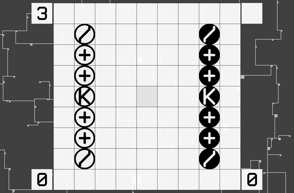 The move count is now 3; player 1 moves their King to score a point. They could have also scored with the Bishop at the top of their line.
