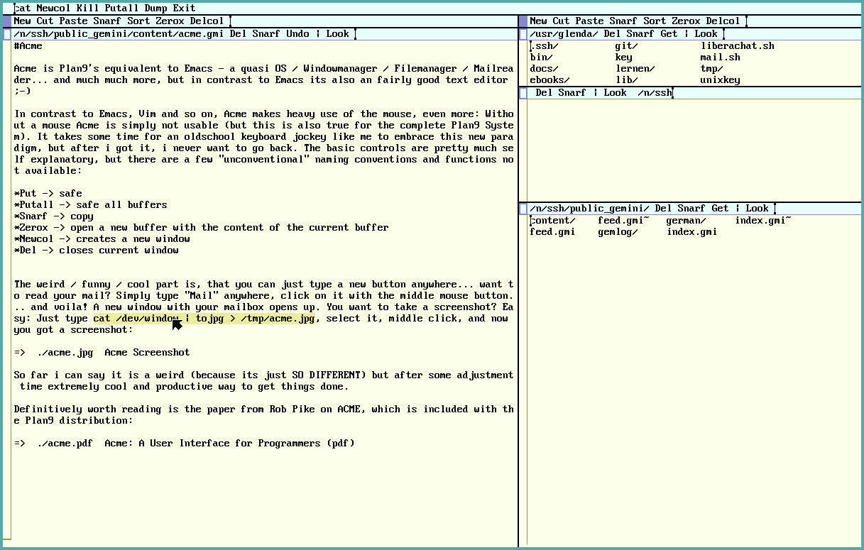 The weird / funny / cool part is, that you can just type a new button anywhere... want to read your mail? Simply type "Mail" anywhere, click on it with the middle mouse button... and voila! A new window with your mailbox opens up. You want to take a screenshot? Easy: Just type cat /dev/window | tojpg > /tmp/acme.jpg, select it, middle click, and now you got a screenshot: