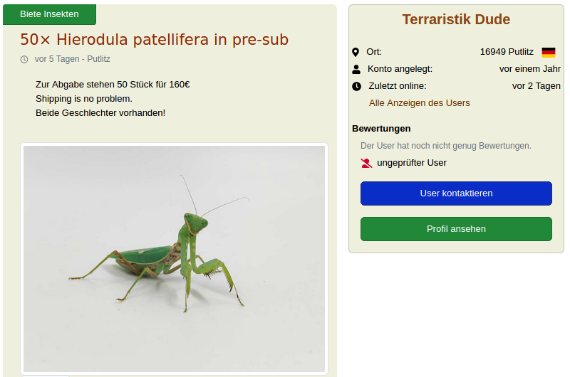 Nachdem ich nun über 10 Jahre lang mit Freuden diesen Onlineshop und die Mantidenzucht betrieben habe, habe ich mich nun dazu entschlossen, das Unternehmen in gute Hände abzugeben.