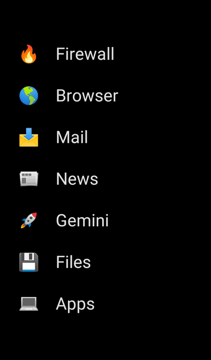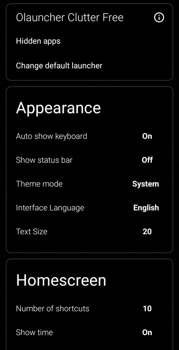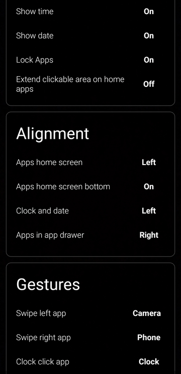 Возможно, это самый приемлемый вариант, на котором лично я и остановлюсь. Чистый текст на черном фоне - без каких-либо иконок, эффектов и "красивостей", плюс часы и дата. Позволяет создавать на экране ровно столько ячеек (т.е. ссылок на избранные программы), сколько хватает свободного пространства при заданном кегле шрифта; менять выключку списка (влево, вправо, по центру). Переназначает ПО для горизональных жестов влево/вправо; скрывает верхнюю управляющую панель; содержит разные темы и локализации. Имеет функционал быстрого поиска программы из общего списка предустановленного ПО. По желанию пользователя можно заблокировать заполненные ячейки от случайных изменений.