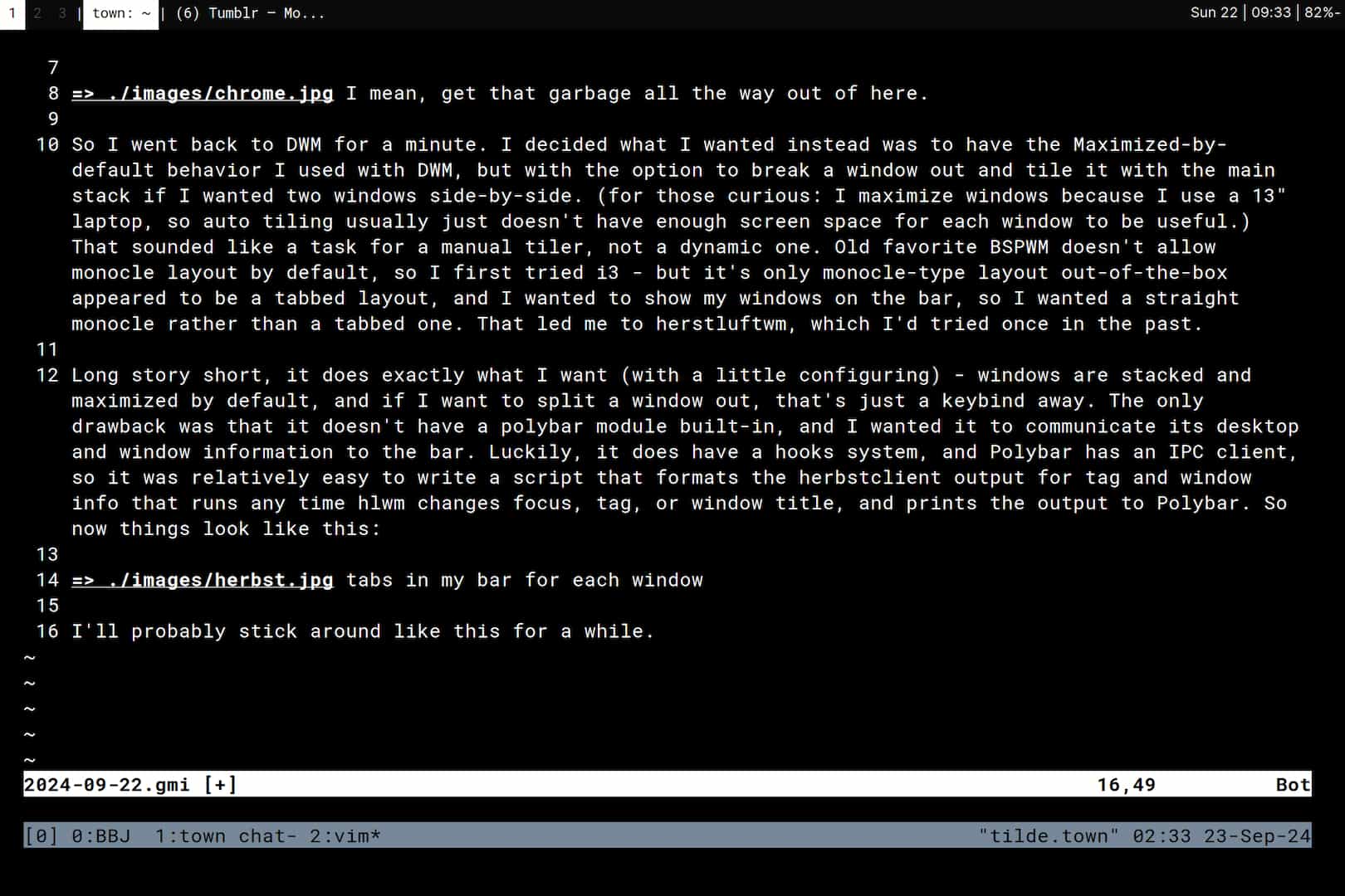 So I went back to DWM for a minute. I decided what I wanted instead was to have the Maximized-by-default behavior I used with DWM, but with the option to break a window out and tile it with the main stack if I wanted two windows side-by-side. (for those curious: I maximize windows because I use a 13" laptop, so auto tiling usually just doesn't have enough screen space for each window to be useful.) That sounded like a task for a manual tiler, not a dynamic one. Old favorite BSPWM doesn't allow monocle layout by default, so I first tried i3 - but it's only monocle-type layout out-of-the-box appeared to be a tabbed layout, and I wanted to show my windows on the bar, so I wanted a straight monocle rather than a tabbed one. That led me to herstluftwm, which I'd tried once in the past.