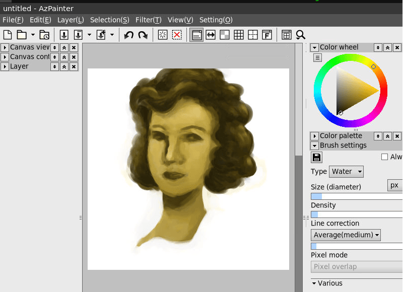 Still very slightly off-kilter without stylus pressure, but it can be somewhat compensated with a few settings. In AzPainter, lowering the flow density in a water brush also helps emulate variable stroke opacity, which is a characteristic of different pressure levels. Stroke tapering is likely in the one of the windows that were minimised due to the miniature — compared with today's widescreen and 4K monitors — screen estate. A pale shadow of stylus pressure dynamic, but certainly better than nothing.