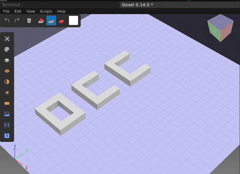 Sadly not very usable on the Pi 3 — CPU usage ratchets up to 375% and add/remove block operations lag, even if memory is at a manageable ~120-150 M for a small file. The application consumes 25% CPU on another armv7 device where it is considerably more responsive, so the issue may be a CPU limitation. Otherwise a nifty voxel editor on a faster CPU.