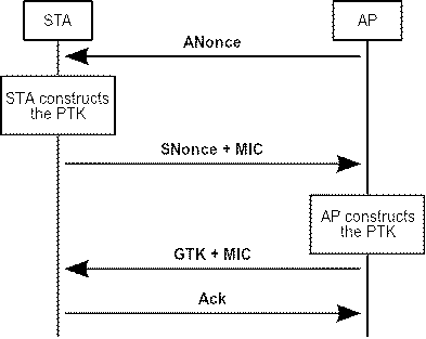 When a client connects to a router, a process called a "4-Way Handshake" occurs, as shown in the image below. (STA is the client and AP is the router)