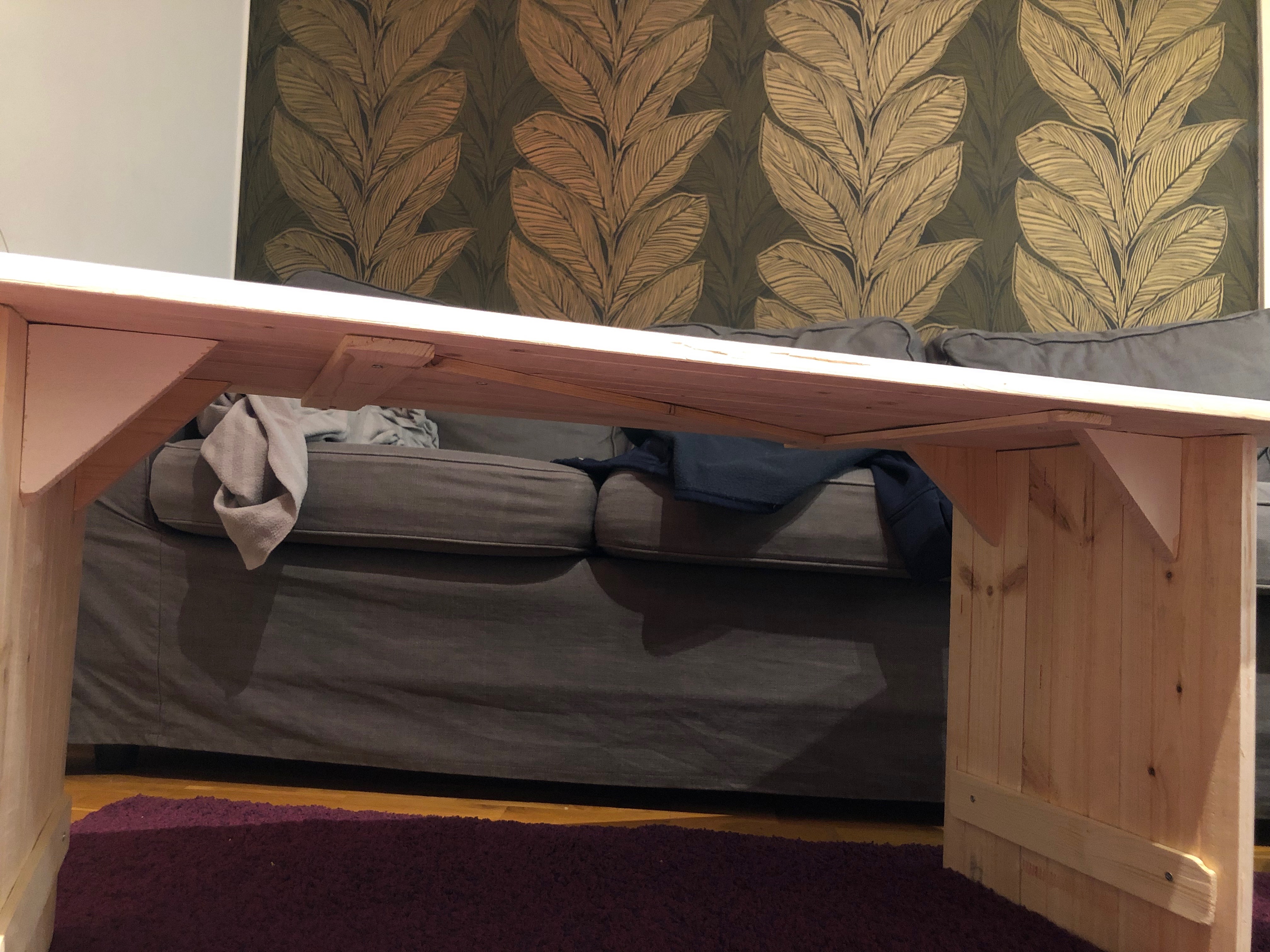 This was without question the cheapest living room table I could find, and it goes well with my home built desk and wardrobe and my second (or probably third or fourth by the looks) hand dining table and dining chairs.