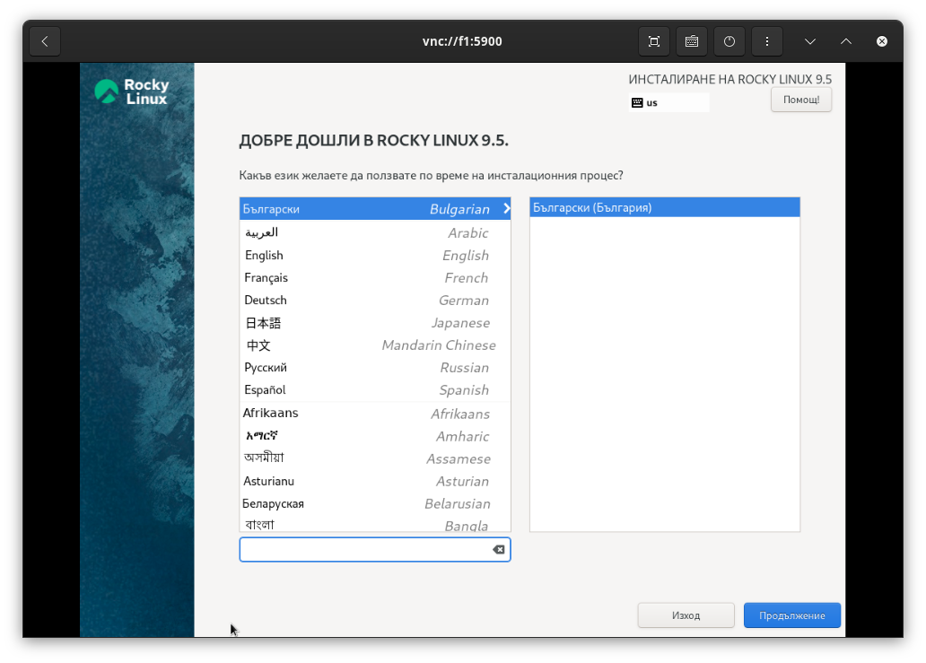 paul@f0:~ % doas vm install rocky Rocky-9.5-x86_64-minimal.iso Starting rocky * found guest in /zroot/bhyve/rocky * booting... paul@f0:/bhyve/rocky % doas vm list NAME DATASTORE LOADER CPU MEMORY VNC AUTO STATE rocky default uefi 4 14G 0.0.0.0:5900 No Locked (f0.lan.buetow.org) paul@f0:/bhyve/rocky % doas sockstat -4 | grep 5900 root bhyve 6079 8 tcp4 *:5900 *:*