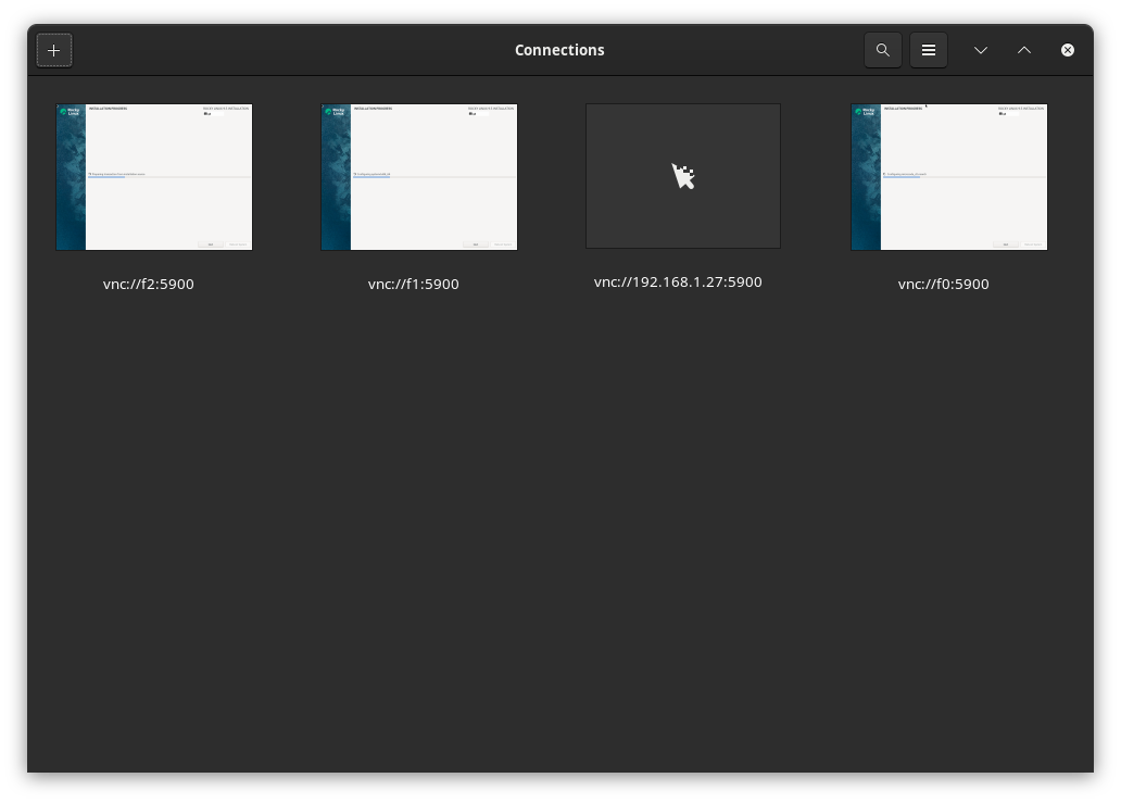 For the installation, I opened the VNC client on my Fedora laptop (GNOME comes with a simple VNC client) and manually ran through the base installation for each of the VMs. Again, I am sure this could have been automated a bit more, but there were just three VMs, and it wasn't worth the effort. The three VNC addresses of the VMs were `vnc://f0:5900`, `vnc://f1:5900`, and `vnc://f0:5900`.