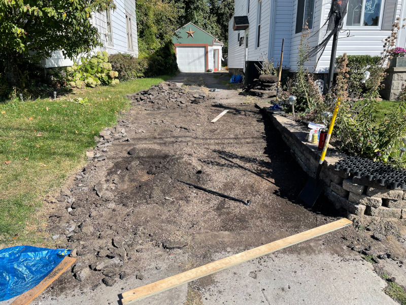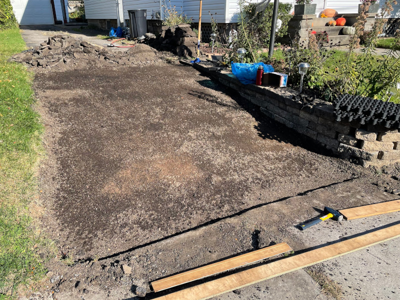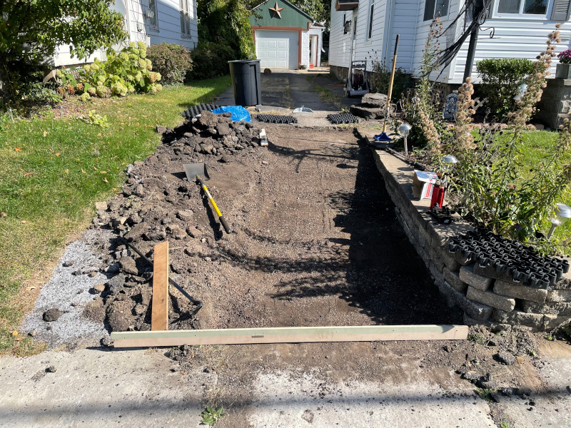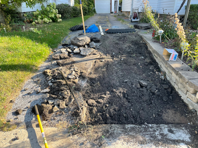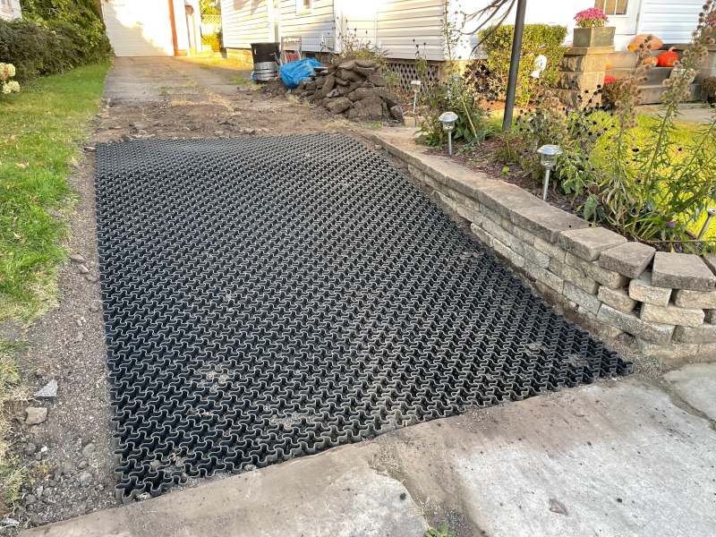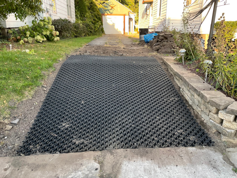 Replacing an eroded driveway entrance with interlocking plastic grid pavers.