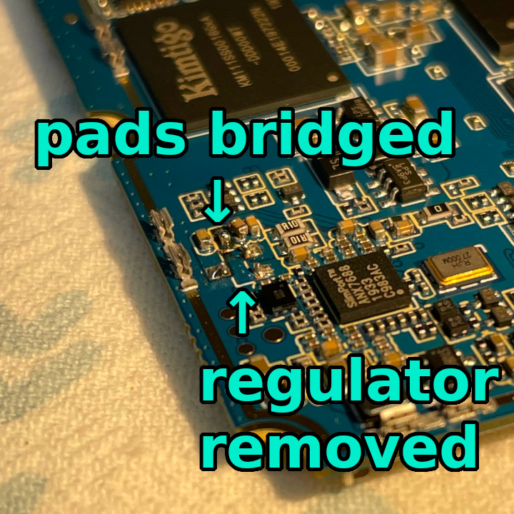 For the VBUS fix, the regulator (larger three-legged component) needs to be removed and the two vacant pads above it need to be connected.