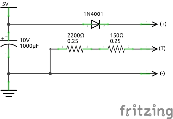 - Add a 1000uF capacitor between (+5V) and (ground) on the circuit. See "Capacitors" at the bottom of the page for warnings and ideas.