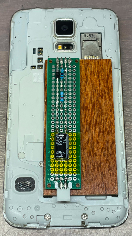 I cut and sanded a piece of flooring to fit into the battery compartment. Then, built and soldered the circuit on a through-hole prototype board and mounted it on top of that with double-sided tape. The 4 pins on the top are bent inward, fit into small grooves in the base and make good contact with the springy terminals of the battery compartment. (I could have just soldered the wires directly to the terminals, but wanted to make this device removable just in case I would ever need the battery again). Power comes through the JST connector at the bottom. (I salvaged a long USB cable with a broken micro-USB plug, so I decided to use JST connectors instead of USB for power).