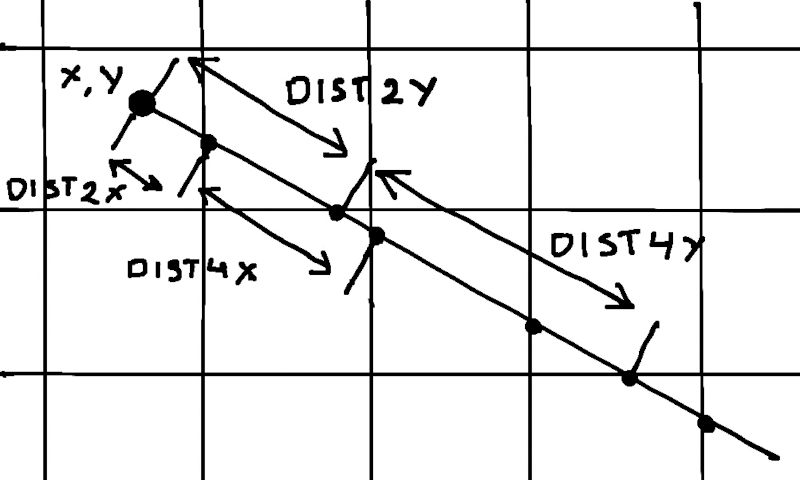 - Subtract DIST2Y (distance moved) from DIST2X (distance still needed to move to next map cel along the X axis)