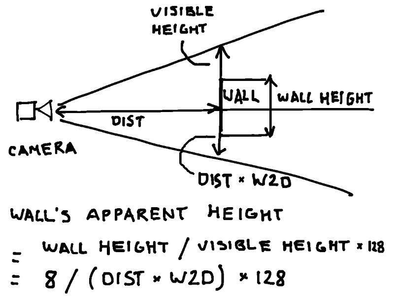 -- ray hit a wall -- find the wall height -- on screen local scrh=8/(dist*cam.w2d)*128 -- find y-coordinate on screen --local scry=64-scrh/2 -- draw the wall line(scrx,64-scrh/2, scrx,64+scrh/2, 8+hita/0.25) break