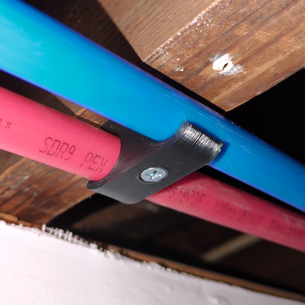Since I run pairs of 1/2" PEX in tight spaces, it is sometimes difficult to use clamps with nails (and I prefer not to hammer close to old rusty pipes), so I designed and 3D-printed a few dozen paired holders for mounting PEX pipes underneath and on the side of joists.