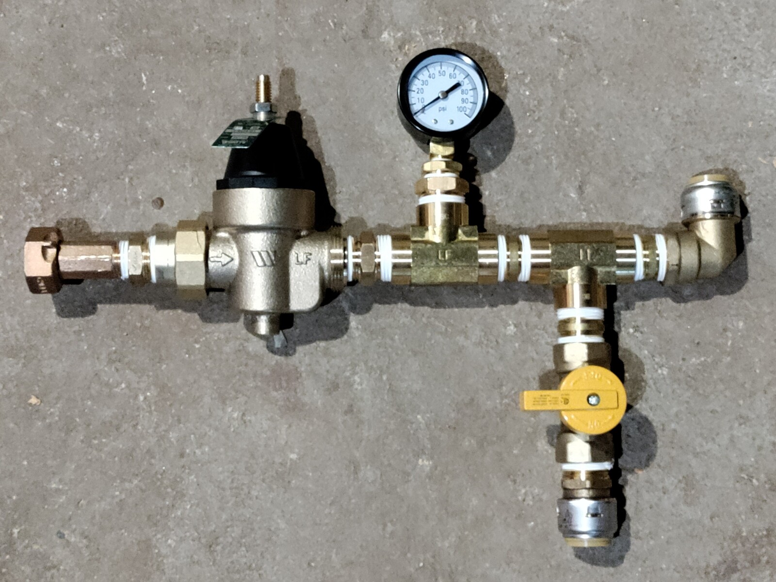 Assembled pressure regulator, pressure meter, push-to-fit connector for a 3/4" pipe going up to the manifold, and a valve going down for a temporary bypass / drain, all connected with brass parts. The meter connector on the left is a special part that I had to order separately, as they are not normally sold in big-box stores.