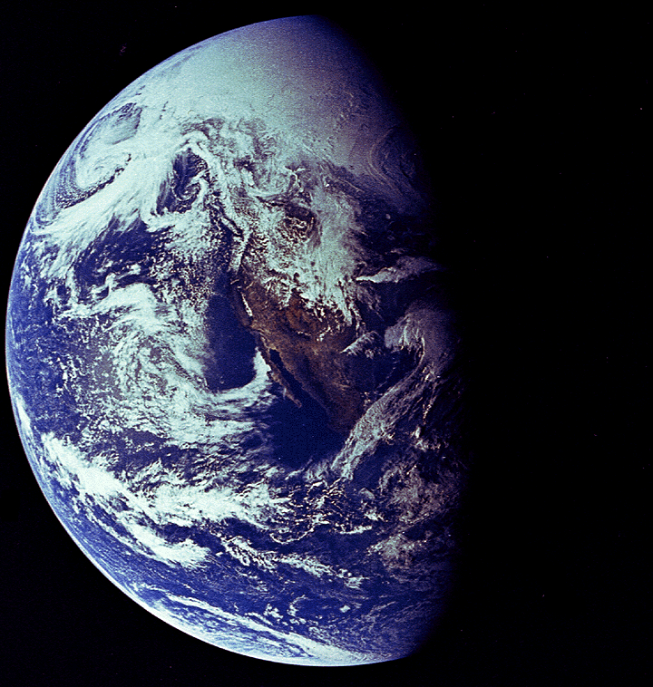 Everybody has seen, whether they're aware of it or not, the "Blue Marble" photograph. Taken in December of 1972 by the crew of Apollo 17, it is one of the most reproduced photographs in human history. It is the classic, go-to image of Earth from space. The scope of this gallery is all the photos of Earth from space taken *before* that one. The early days of the whole undertaking, when you had to lug your camera up out the gravity well *both* ways and guess the aperture setting from a rule of thumb and you never knew if you were gonna get a clear shot or not. The times when every new photo had a decent chance at a new claim to fame, the first one to show this, the first one taken like that. None of this false-colour computer composite nonsense. Proper good old fashioned Earth from space.