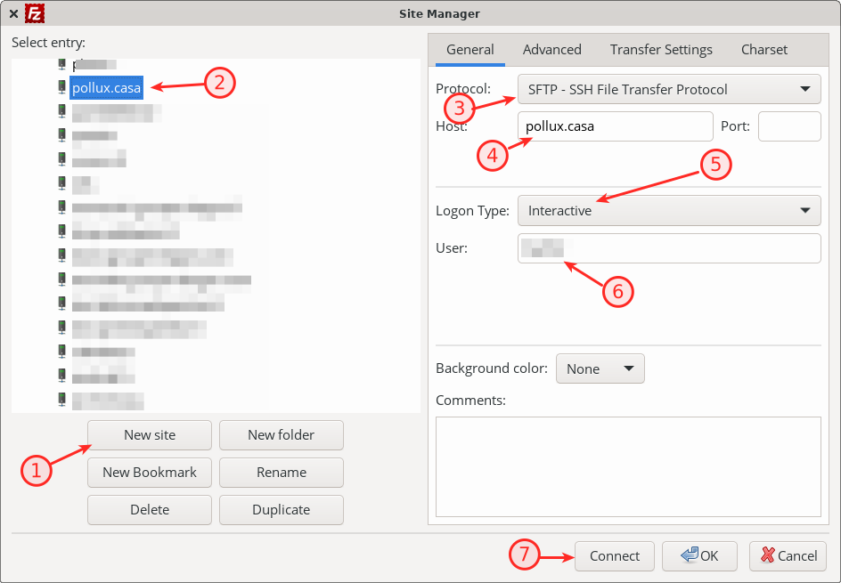 To connect to pollux.casa server, you need to use an SFTP client (Ssh File Transfer Protocol). Many tools exist. Maybe the most common is Filezilla