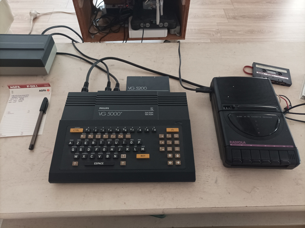 Ensuite on exécute la commande CLOAD et on fait play sur le lecteur cassette (ou dans mon cas il y a un pilotage du démarrage de la lecture via un fil commandé par le VG5000, mais à l'utilisation c'est pénible parce qu'on ne peut pas rembobiner manuellement ou faire des avances rapides, donc je l'ai débranché).
